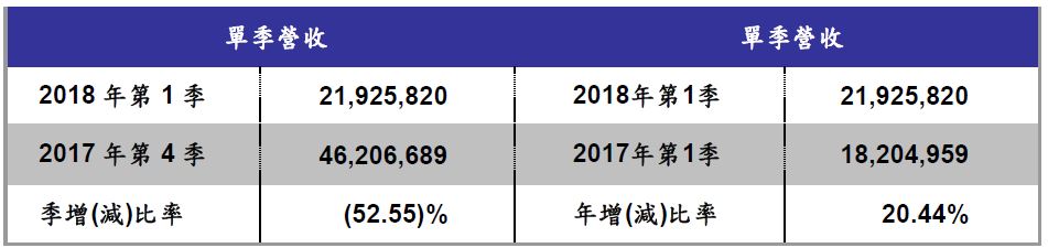 2018 年第 1 季合併營收為新台幣 219.26 億元,較前一季減少 52.55%,較 2017 年同期增加20.44%。