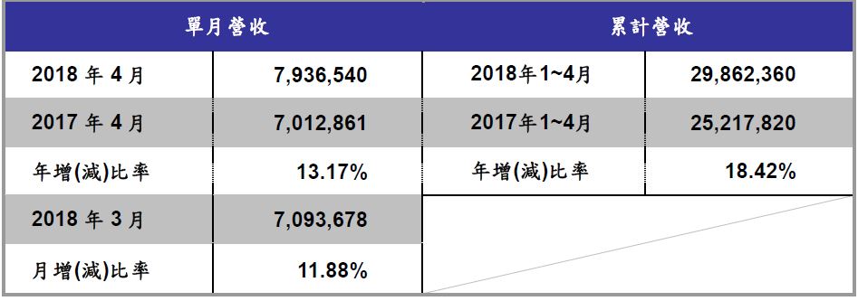 累計2018年1至4月合併營收為新台幣298.62億元,較去年同期增加18.42%。