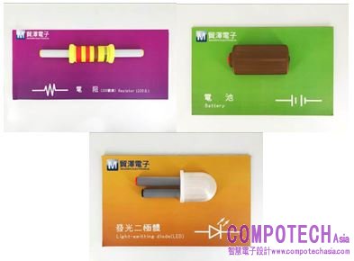 這塊電子實習教學示範板將常用的多種電子元件,依其外型或特性,放大尺寸後,以3D印表機印製。這些元件不僅是放大的模型,同時具備了正常電子元件的功用。所以,未來在課堂上,老師們可以用更清晰、生動的方式,協助學生加以了解如何操作及運用這些電子元件;也可以更互動的方式,與同學們分享創作與創意。