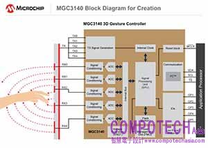 Microchip全新的手勢控制器以電容技術為基礎,適用於大量可減少駕駛分神和提高車輛操作便捷性的應用,是導航資訊娛樂系統、遮陽板操作、車內照明和其他應用的理想之選。這項技術還支援開啟腳控後升車門和製造商希望透過簡單的手勢整合到車內的任何其他功能。MGC3140獲得了汽車電子委員會AEC-Q100認證,滿足汽車系統設計嚴格的電磁干擾(EMI)和電磁相容性(EMC)要求。每個3D手勢系統都包含一個感測器和Microchip手勢控制器,感測器可以使用任何導電材料製成,而手勢控制器是專為特定應用而打造。