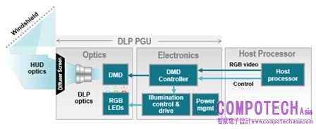 運用 DLP® 技術獨特的中間擴散片結構,可設計出能夠承受經由太陽光放大所產生熱負載 (thermal load) 的HUD。如圖3所示,以DLP技術為基礎的HUD可將影像投影到擴散片上,HUD光學元件再將其放大並投影至擋風玻璃上以反射呈現於駕駛眼前。在TFT HUD中,TFT面板連接到HUD光學元件,取代了擴散片和輔助電子元件。