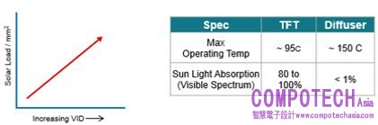 為了更瞭解擴散片的優勢,我們不妨來看看擴散片與傳統TFT面板的物理特性(圖4)。擴散片具有兩大主要優勢,包括更高的工作溫度,以及擴散片並不會吸收大量的入射可見光。(光譜的紅外 [IR] 和紫外 [UV] 部分很容易被過濾。)