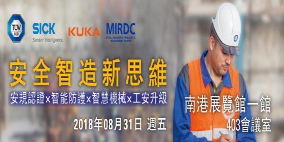 2018年8月23日--智慧自動化蓬勃發展,工廠安全相關的安規認證與感測防護也正同步改變並提出了新的標準,以確保智慧工廠內機械設備能保有高可靠性、高安全性。TÜV SÜD Taiwan、SICK Taiwan、KUKA Taiwan與金屬工業研究發展中心 MIRDC將於今年 8 月 31 日上午09:30~12:00,於台北南港展覽館一館403會議室舉辦「安全智造新思維」研討會,將針對安規認證、智能防護、智慧機械與工安升級等四大面向,深入探討企業在進行智慧化、數位化轉型時,所衍生的安全防護控制議題,且將特別聚焦在自動化安全標準評估、智慧感測分析與管理、人機協作智慧生產以及智慧化升級補助等創新技術與輔助措施,讓工廠逐步實現智慧製造之際,可避免系統故障與人員操作意外等工場安全事故,並能更有效率、靈活彈性、高品質地完成作業。欲瞭解更多資訊,請造訪 安全智造新思維研討會。