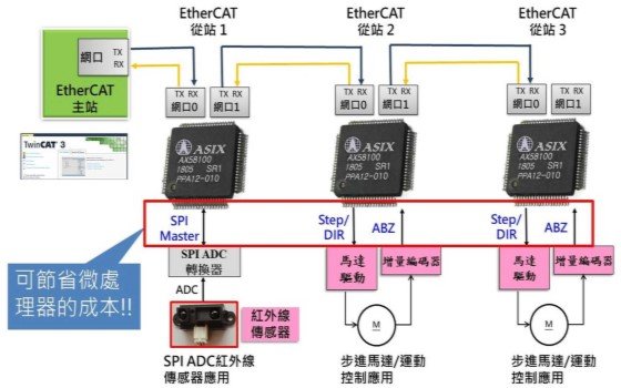 相對於其它EtherCAT從站控制器解決方案,AX58100已整合兩個可同時支援光纖和銅線網路應用的高速乙太網路PHY並支援一些額外的控制介面,例如脈衝寬度調變(PWM)介面,增量(ABZ)/霍爾編碼器介面,SPI Master介面,32個數位控制I/O, I/O看門狗,緊急停止輸入等等,讓客戶可以不需要額外微處理器就能輕鬆地將AX58100設計在各種不同的EtherCAT工業乙太網路現場總線產品應用中。針對現有的傳統現場總線產品,AX58100提供兩種過程數據介面(PDI),Local Bus介面和SPI Slave介面,客戶可以透過這些介面將AX58100連接到傳統現場總線產品的微處理器,就可以輕鬆地支援EtherCAT從站功能。AX58100提供客戶一個簡單設計,經濟有效的EtherCAT工業乙太網路從站解決方案,可適用於各種實時自動控制產品應用,如工業自動化,馬達/運動控制,數位 I/O控制,類比數位轉換器(ADC)/數位類比轉換器(DAC)控制,感測器數據採集,機器人轉軸控制等等。