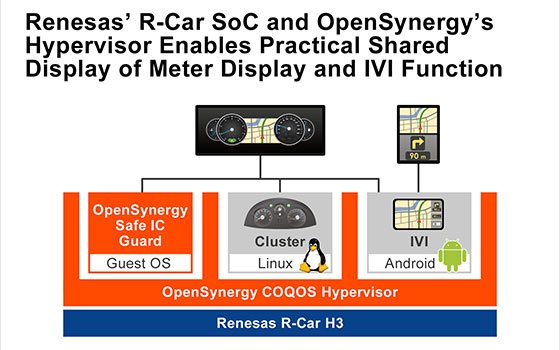 OpenSynergy的COQOS Hypervisor SDK,能讓多個作業系統同時使用R-Car H3 GPU,而不會出現干擾問題,並可存取多個顯示器。舉例來說,在Android上運行的IVI應用程式,以及在Linux上運行的儀表板軟體,便可以共享顯示器。其中的螢幕管理器能控制儀表板內的共享顯示,以確保各影像內容不會遮蓋到與安全性有關的關鍵資訊。COQOS Hypervisor SDK還包括一個符合AUTOSAR標準的CAN閘道器,可在瑞薩R-Car H3上的Arm®Cortex®-R7core上運行,藉此可確保與車載網路之間的嚴密連接。
