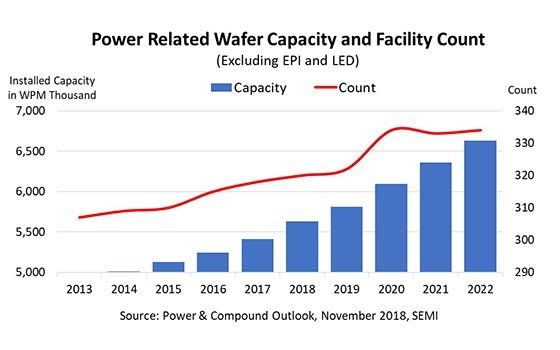 2018年11月27日--SEMI(國際半導體產業協會)今天公布業界第一份聚焦功率暨化合物半導體領域的全球晶圓廠資料 —「功率暨化合物晶半導體圓廠展望」(Power and Compound Fab Outlook),提供全面性的前段半導體晶圓廠資訊,並預測從2017至2022年,全球將興建16 個功率暨化合物半導體晶圓廠,整體產能將成長23%,每月投片量將達120萬(8吋約當晶圓)。