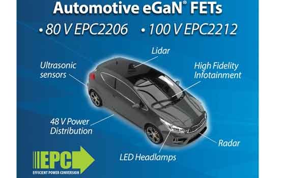 基於氮化鎵(eGaN)技術的產品已進行量產超過8年,累計了數十億小時的實際汽車應用經驗,包括全自動駕駛汽車的雷射雷達及雷達系統、應用於數據中心電腦的48 V–12 V DC/DC轉換器、具有超高保真度的資訊娛樂系統及高強度的貨車頭燈等應用。這些全新元件已經通過嚴格的AEC Q101測試認證,隨後會推出更多面向嚴峻的車用環境的離散電晶體及積體電路。