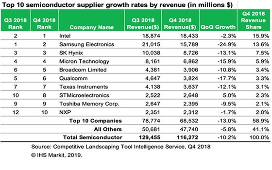 2019年3月12日--面向移動手機和企業伺服器的半導體市場下滑,導致半導體製造商的市場份額排名出現調整。雖然過去五個季度三星在半導體銷售方面一直處於領先地位,2018年第四季度英特爾反超了三星。第四季度,英特爾的半導體銷售收入達到184億美元,三星同期為158億美元。但據IHS Markit(納斯達克股票代碼:INFO)資料顯示,2018年第四季度,英特爾半導體銷售額環比下降2.3%,而三星銷售額環比則下降24.9%。