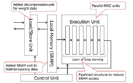 - 減少了動態隨機存取記憶體(DRAM)存取。傳統的系統級晶片沒有本機記憶體,無法在靠近DNN執行單元的位置保存臨時資料,並且在存取本機記憶體時產生較大功耗。同時,載入用於MAC計算的加權數據也會產生較大功耗。東芝晶片可在DNN執行單元附近執行靜態隨機存取記憶體(SRAM),並將DNN處理分為多個子處理區塊,因此可將臨時資料保存在SRAM內,從而減少了DRAM存取。此外,東芝還在加速器上增加了一個解壓縮單元。可透過解壓縮單元載入預先壓縮並儲存在DRAM中的加權數據。因此,降低了載入來自DRAM的加權數據時產生的功耗。