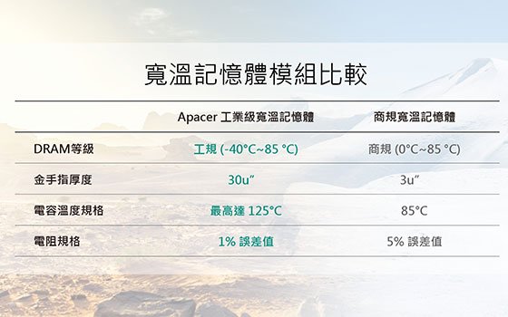 近年來異常急凍或酷暑氣候頻繁發生,不論是常位於戶外、散熱不易的邊緣運算裝置、車用電子產品,或鄰近廠房熱源的智慧機械應用,工控記憶體支援工業級寬溫(-40°C~85°C)已是必要條件。有別於市面上工控記憶體採用商規IC,以篩選(sorting)方式生產商規寬溫記憶體,宇瞻DDR4 2666高效能寬溫記憶體,堅持使用原廠工規等級寬溫IC,避免商規IC於極端高低溫環境下的高故障率與失效率。