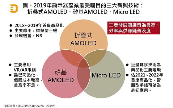 於年初MWC 2019掀起熱潮的折疊式AMOLED面板,仍舊是FPD China 2019展會的主角之一,可見折疊式AMOLED做為最熱門新興顯示技術的地位。根據DIGITIMES Research分析師楊仁杰分析,儘管2019年因價格過高難以創造規模銷售,但未來隨大陸AMOLED業者陸續量產,且扶植本土材料與設備商後,折疊式AMOLED的價格有機會達到甜蜜點,提升普及率。