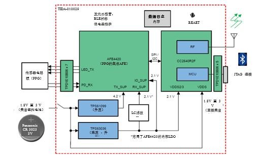 採用Bluetooth®5的多波長光學HRM和SpO2監控參考設計採用AFE4420單晶片生物傳感前端,同時支持四個LED和四路時分多工光電探測器輸入。它集成了靈活的LED驅動器和光電探測器的完整接收器鏈。