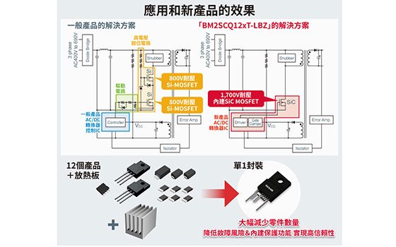 本產品採用一體化封裝,與採用Si-MOSFET的普通離散式結構相比較,零件數量大幅減少,1個封裝內包含多達12種產品(AC/DC轉換器控制IC、800V耐壓Si-MOSFET×2、齊納二極體×3、電阻×6)和散熱板。另外,由於SiC MOSFET具有高耐壓、抗干擾性能優異的特點,還可實現降噪零件的小型化。