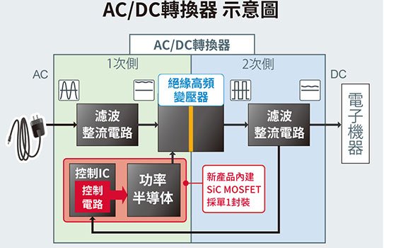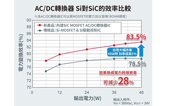 在高耐壓範圍中,SiC MOSFET與Si-MOSFET相比,具有「開關損耗與導通損耗小」、「支援大功率」、「可確實對應溫度變化」等優勢。基於這些優勢,當SiC-MOSFET用於AC/DC轉換器和DC/DC轉換器等中時,可帶來更高的功率轉換效率、散熱器件的小型化、高頻工作使線圈更小等好處,具有更節能、零件數量更少、安裝面積更小等效果。