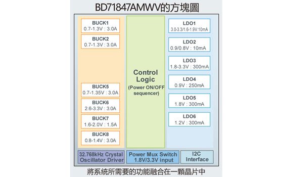 1.將 i.MX 8M Mini 所需的電源功能整合在一顆晶片中「BD71847AMWV」的電源電路是根據 i.MX 8M Mini 應用處理器的電源系統設計而成,集控制邏輯、6 通道降壓型 DC/DC 轉換器(Buck Converter)、6 通道 LDO*2於一身,僅需 1 枚晶片,不僅可為處理器供電,還可為應用所需的 DDR 記憶體供電。此外,還內建有 SDXC 卡用 1.8V/3.3V 開關、32.768kHz 晶振緩衝器以及眾多保護功能(各電源系統的輸出短路、輸出過電壓、輸出過電流及熱關斷等)。該產品還搭載了功率轉換率高達 95%的降壓型 DC/DC 轉換器,輸入電壓範圍更寬,支援從 1cell 的 Li-Ion 電池到 USB 的廣泛電壓範圍(2.7V~5.5V),可說是最適合 i.MX 8M Mini 處理器運用領域的 PMIC