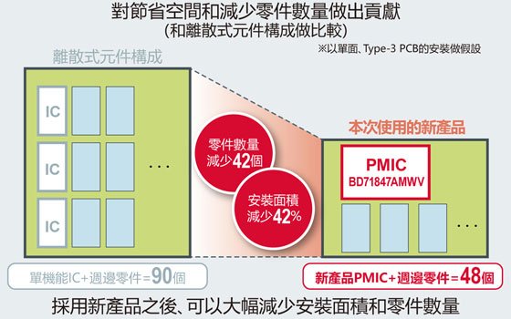 「BD71847AMWV」是一款運用 ROHM 長年累積的處理器電源技術,集成處理器所需電源系統(Power Rail)與機能的 PMIC。除了具有 95%最高功率轉換率的 DC/DC 轉換器*1 之外,也將系統所需要的電源和保護功能整合在一顆晶片中,同時還內建進行電源管理的 ON/OFF 時序器,不僅有助於應用的小型化,也簡化了應用設計,大幅縮減開發時程。
