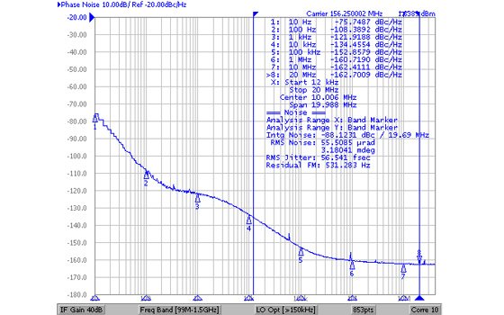 採用 56G PAM-4 串聯器/解串器(SerDes)解決方案的特定交換應用IC 供應商要求在 12 kHz 至 20 MHz 波段內的最大積分參考時鐘抖動(integrated reference clock jitter)為 150 fs 均方根( Root Mean Square )。採用TI BAW諧振器技術的網路時鐘同步器,例如 LMK05318,通常具有小於 60 fs(156.25-MHz載體)的積分RMS 抖動(integrated RMS jitter )(12 kHz至20 MHz),如圖 2 所示。這種性能水準可以幫助設計人員為他們的系統提供面對未來的保障。