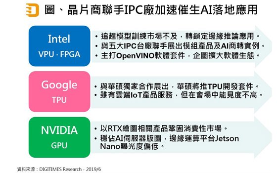 Google TPU與華碩獨家合作,展示即時AI視覺辨識成果,二者合作後的未來動向值得市場關注;NVIDIA主要鞏固消費性繪圖市場及AI伺服器應用,先前在GTC大會發表邊緣應用Jetson Nano在會場中能見度偏低。