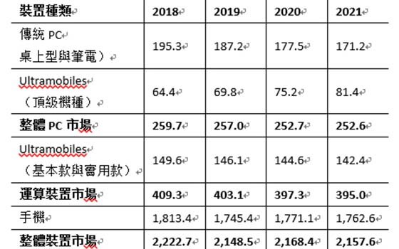 表1:2018-2021年全球各類裝置出貨量(單位:百萬台)