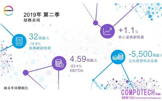 基於2019年上半年的業績表現,科思創已確認本會計年度的財務指引。如預期,公司在第二季持續於主要銷售市場面臨嚴峻的競爭壓力和不確定性。儘管第二季核心業務銷售量與去年同期相比成長1.1%,集團銷售總額因受到較低的銷售價格影響而下降至32億歐元(- 16.9%)。稅前息前折舊前攤銷前利潤(EBITDA)為4.59億歐元,與 2019年第一季(4.42億歐元)持平,但與去年同期的優異業績相比仍有顯著差距(- 53.4%)。整體利潤下降主要受到聚氨酯和聚碳酸酯事業利潤率下降影響。由於營業活動產生的現金流減少,且投資增加,淨利降至1.89億歐元,而自由營運現金流量則為負5500萬歐元。