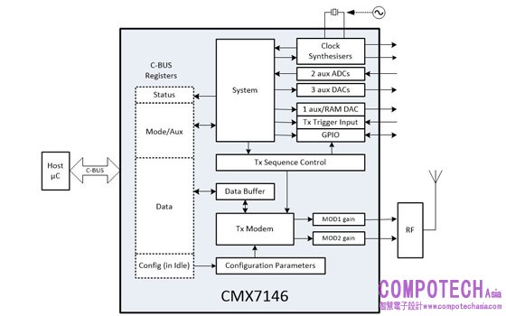 CMX7146能通過可程式設計信號濾波生成精確的基帶模擬同相(in-phase)和正交信號,這樣產生的高精度信號完全可用於傳輸,並且適合於針對用戶選擇的RF載波進行上變頻。