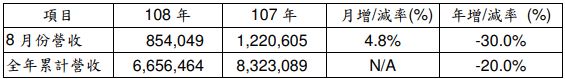 創意電子股份有限公司(股票代碼:3443) 今(5)日公佈2019年8月份營業額為新台幣 8 億 5 仟 4 佰萬元。與上個月份營業額比較,增加 4.8%。與2018年同期營業額比較,則減少 30.0%。2019 年前八月累計營收為新台幣 66 億 5 仟 6佰萬元,較去年同期減少 20.0%。