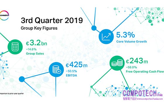 儘管經濟環境仍備受挑戰,科思創在2019年第三季核心業務銷量與去年同期相比仍成長5.3%。同時,受較低的銷售價格影響,集團銷售總額下降14.6%至32億歐元,符合預期。而銷售價格亦影響稅前息前折舊前攤銷前利潤(EBITDA),同比下滑50.5%至4.25億歐元,符合預測。淨利則下降70.4%至1.47 億歐元。因營運活動產生的現金流量減少以及投資計畫安排,自由營運現金流量為2.43億歐元,降低58.0%。