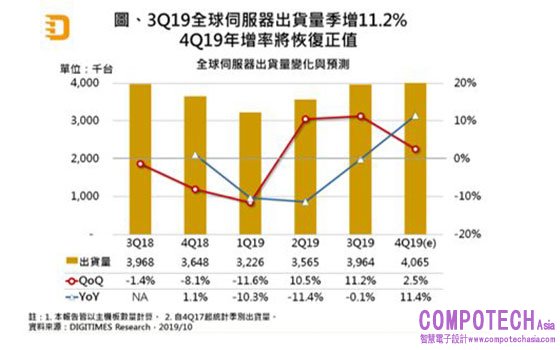 根據DIGITIMES Research分析師徐康沛統計與分析,自2018年下半至2019年第1、2季消化庫存告一段落後,2019年第3季全球伺服器出貨量季增11.2%,與上季預期相近,第4季可望再小幅季增,優於原本小幅衰退的預期,並恢復年成長,但因上半年年減幅度大,2019全年全球伺服器出貨量恐難逃負成長。