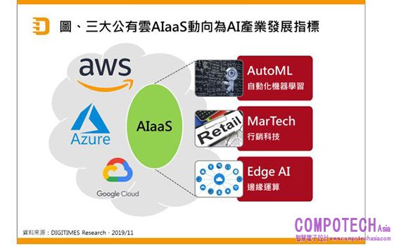 全球前三大公有雲平台包含亞馬遜(Amazon)的AWS、微軟(Microsoft)的Azure及Google的GCP (Google Cloud Platform)皆積極完善其AI即服務(AI as a Service;AIaaS)項目,包含AutoML、MarTech及Edge AI三大策略,以鞏固在AI產業的影響力。DIGITIMES Research分析師陳辰妃認為,隨著這些公有雲平台AIaaS服務項目的進展,將有助於企業簡化繁瑣的AI開發流程、優化企業既有業務項目,以及拓展邊緣端智慧應用,加速產業智慧化進程。