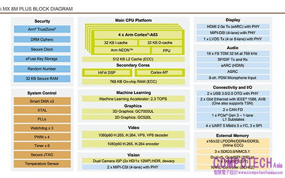 i.MX 8M Plus整合可提供運行速度達2.3 TOPS(每秒兆次運算)的高效能NPU與主頻高達2GHz的四核心Arm® Cortex-A53子系統、主頻可達800MHz基於Cortex-M7的獨立即時子系統、運用於語音與自然語言處理的高效能800 MHz音訊DSP、雙鏡頭影像訊號處理器(Image Signal Processors;ISP)、以及用於豐富圖像渲染的3D GPU。透過整合高效能Cortex-A53核心與NPU,邊緣裝置將能夠在少量或無人為干預的情況下,支援機器學習和推論輸入,進而在本地端做出明智決策。具有成本效益的i.MX 8M Plus的應用範圍涵蓋人與物體辨識,支援公共安全、工業機器視覺、機器人、手勢、情緒檢測與自然語言處理,進而以極快反應時間和高精確率,實現人與裝置間的無縫互動。