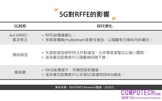 伴隨5G時代到來,攸關終端裝置收訊品質且影響手機耗電量的射頻前端(Radio Frequency Front End;RFFE),在設計架構和製程等皆面臨極大變化。由於5G涵蓋高、中、低頻譜且頻寬廣,並採用4x4 MIMO (Multi-in and Multi-out)和載波聚合(Carrier Aggregation;CA)技術,使RFFE架構越趨複雜且元件數增加、走向高度模組化;此外DIGITIMES Research分析師黃雅芝觀察到,手機產業鏈也邁向高度整合,於Android陣營中更儼然形成高通(Qualcomm)與聯發科搭配Skyworks和Qorvo的競爭。