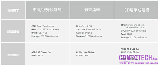圖說: AERO創作者筆電需求對應表(點我了解更多)
