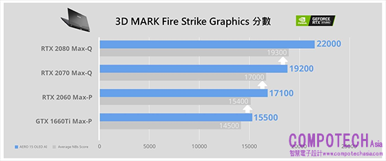 圖說:從 3DMark 測試工具軟體來檢視3D繪圖的效能表現,AERO 15 OLED功能搭配 RTX 顯卡,比起一般筆電同樣環境下效能還要高上10%以上。