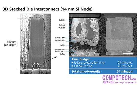圖一_蔡司Crossbeam Laser FIB-SEM為先進半導體封裝加速封裝失效分析及製程優化。透過將飛秒雷射、鎵離子FIB與場發射電子顯微鏡整合成單一工具,以提供最快速的指定區域橫切面工作流程。