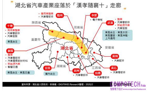 根據DIGITIMES Research分析師林芬卉與陳一帆觀察,武漢肺炎重災區湖北省佔大陸汽車產量達8.77%,為大陸第四大汽車生產基地,相關供應鏈業者超過千家,因此受疫情影響大。當地重要汽車零部件如車身系統、底盤系統亦供予湖北省以外業者,工廠停產殃及週圍省份的汽車供應鏈。