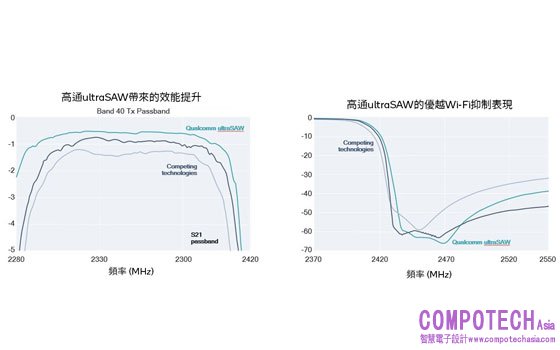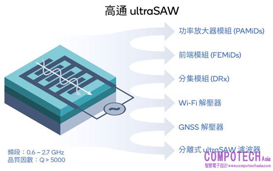 射頻(RF)濾波器能夠分離從手機接收與傳送資訊,不同頻段中的無線電訊號。高通ultraSAW濾波器能將插入損失提升多達1分貝,與競爭對手的體聲波(BAW)濾波器相比,高通ultraSAW濾波器能在2.7 GHz以下頻段提供效能更高的解決方案。