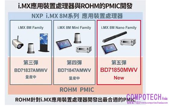 ROHM 一直致力於開發適合 NXP 公司 i.MX 8M 系列的 PMIC,於 2018 年推出適用「i.MX 8M 系列」的 PMIC「BD71837MWV」後,於 2019 年再推出適用於「i.MX 8M Mini 系列」的 PMIC「BD71847AMWV」。此次,又針對採 用先進製程且具有優異節能性的「i.MX 8M Nano 系列」,推出可支援 i.MX 8M 系列所有應用處理器的電源管理之全 新 PMIC「BD71850MWV」。