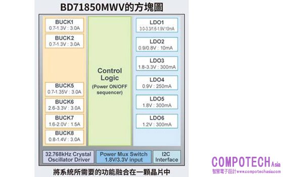 「BD71850MWV」的電源電路根據 i.MX 8M Nano 應用處理器的電源系統設計而成,集控制邏輯、6 通道降壓型 DC/DC 轉換器(Buck Converter)、6 通道 LDO*2 於一身,僅需 1 顆晶片即可為處理器以及應用所需的 DDR 記憶體供電。此外, 還內建有 SDXC 卡介面用 1.8V/3.3V 切換開關、32.768kHz 晶振緩衝器及多種保護功能(各電源系統的輸出短路、輸出 過電壓、輸出過電流及熱關斷功能)。