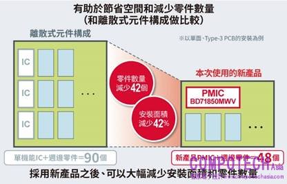 採用小型 QFN 封裝(7mm x 7mm, 高度 1mm Max, 間距 0.4mm,56pin),不僅可提供所需的電源功能,PMIC 的引腳配置設計 能讓 i.MX 8M Nano 應用處理器和 DDR 記憶體的連接更加容 易,有助於減輕 PCB 板佈局設計時的負擔。在相同電源系統 下,本次的新產品與離散式元件的產品相比,零件數量可減 少 42 個,安裝面積可縮減 42%(在單面佈線、Type-3 PCB 條 件下)。另外,如果採用雙面安裝,則僅需不到 400mm2 的空 間即可擁有同樣的電源功能。