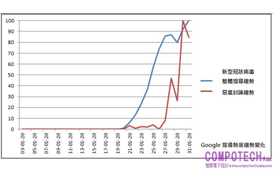 病毒可透過飛沫、肢體接觸甚至空氣等多種形式傳播;惡意軟體與病毒的相似之處,在於兩者都會尋找不同的載體進行滲透。隨著新型冠狀病毒的威脅引發全球高度關注,網路犯罪者便利用病毒為主題進行惡意活動。由下方Google搜尋趨勢比較圖可見,近期對於新型冠狀病毒的搜尋度極高,而相關的惡意討論也大幅提升。