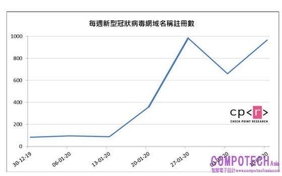 自新型冠狀病毒爆發以來,除了電子郵件惡意活動外,Check Point還發現大量新網站註冊了與該病毒相關的網域名稱,下圖即顯示了自去年(2019)底至今年2月中每週新型冠狀病毒網域名稱註冊數量: