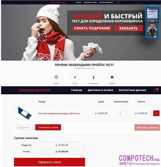 以vaccinecovid-19\.com為例(見下圖),此網站創建於2020年2月11日,註冊地點為俄羅斯,網站內宣稱將「以 19,000盧布(約300美金)的特別價格出售最佳、最快的新型冠狀病毒檢測試劑」。