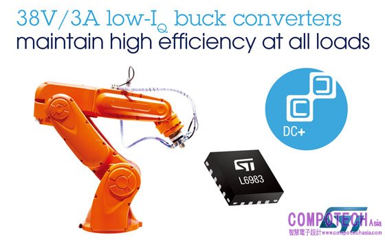 L6983轉換器的輸入電壓範圍是3.5V至38V,是一個高效而具彈性的工業電源解決方案。其適用於12V和24V工業匯流排供電系統、電池供電設備、智慧大樓控制器等分散式智慧節點,以及智慧感測器等不間斷的裝置。L6983有3.3V、5V和可調輸出電壓三種型號供客戶選擇。