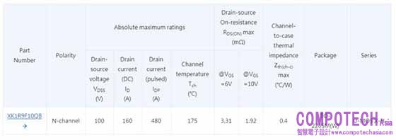 東芝電子元件及儲存裝置株式會社(東芝)推出100V N通道功率金屬氧化物半導體場效應電晶體(MOSFET) - XK1R9F10QB,其適用於汽車的48V設備應用,例如負載開關、開關電源和馬達驅動。出貨即日啟動。