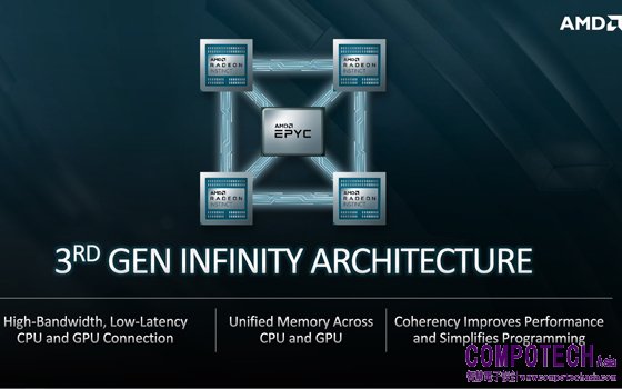 AMD第3代Infinity架構,將提供高頻寬、低延遲的連結通道,銜接El Capitan每個節點內的4個Radeon Instinct GPU以及1個AMD EPYC CPU。此外,AMD第3代Infinity架構為CPU與GPU配置統一記憶體,讓程式設計者更容易存取加速運算資源。