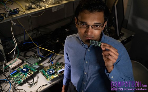 英特爾神經形態運算實驗室資深研究科學家Nabil Imam於美國加州聖塔克拉拉市的神經形態運算實驗室手持Loihi神經形態測試晶片。他和康乃爾大學的研究小組正於電腦晶片上建立數學演算法,以模仿聞到氣味後大腦神經網路中的運作模式。