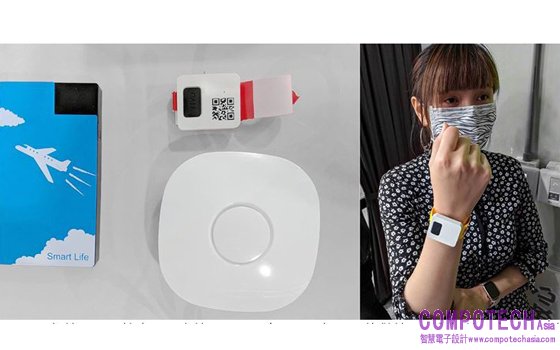 圖說:在經濟部技術處科技專案的支持下,資策會服創所提供區塊鏈技術,與智慧時尚公司開發「平安環離家警報器」,今(24)日正式推動試用,圖為居家隔離及檢疫時需裝置的相關設備,包含:連網設備(左圖左)、智慧手環(左圖右上)、居家感測器(左圖右下),以及受隔離檢疫者配戴狀況示意(右圖)。
