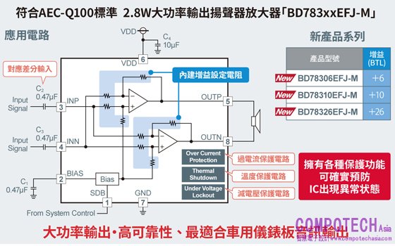 「BD783xxEFJ-M」是針對方向燈轉向音、警告音以及歡迎語音、語音支援等需要大音量輸出各種語音的車用儀錶板所研發而成的揚聲器放大器。該產品採用全新過電流保護電路,實現了過去難以兼顧的輸出短路保護(引腳意外接觸導致的損壞)和2.8W大功率輸出。