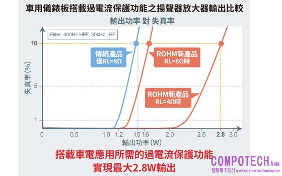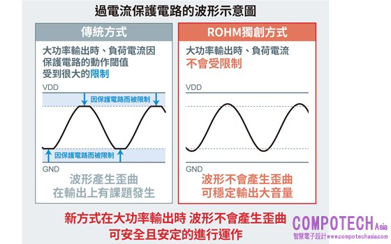 而ROHM獨創的全新過電流保護電路,在大功率輸出時也不會發生波形失真,無需限制輸出。因此「BD783xxEFJ-M」可實現過去難以兼顧,因過電流保護導致的輸出短路保護和大功率輸出(4Ω負載、失真率10%時,最大2.8W輸出)。