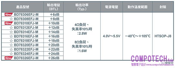 2020年3月25日 --半導體製造商ROHM(總公司:日本京都市)針對具自動駕駛和ADAS功能的車用儀錶板面板(以下簡稱為車用儀錶板),研發出符合車電產品可靠性標準AEC-Q100的2.8W輸出AB類單聲道揚聲器放大器「BD783xxEFJ-M」(BD78306EFJ-M / BD78310EFJ-M / BD78326EFJ-M)。